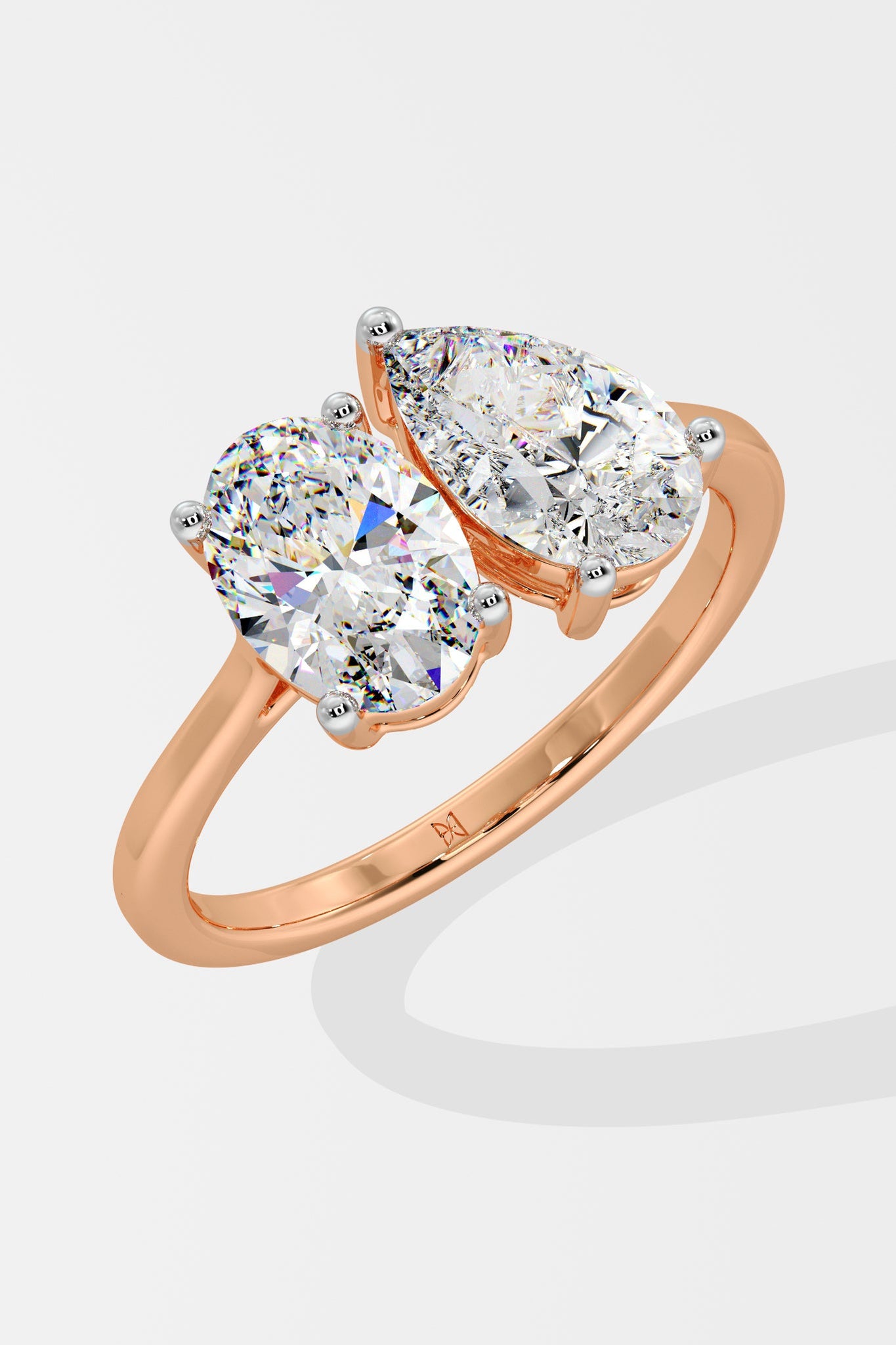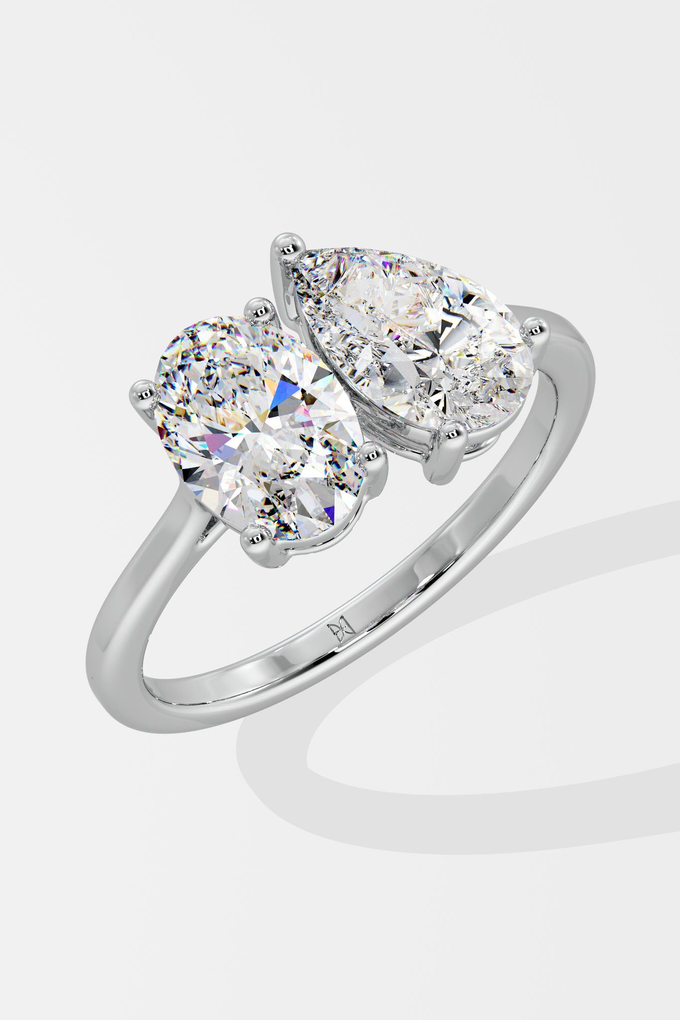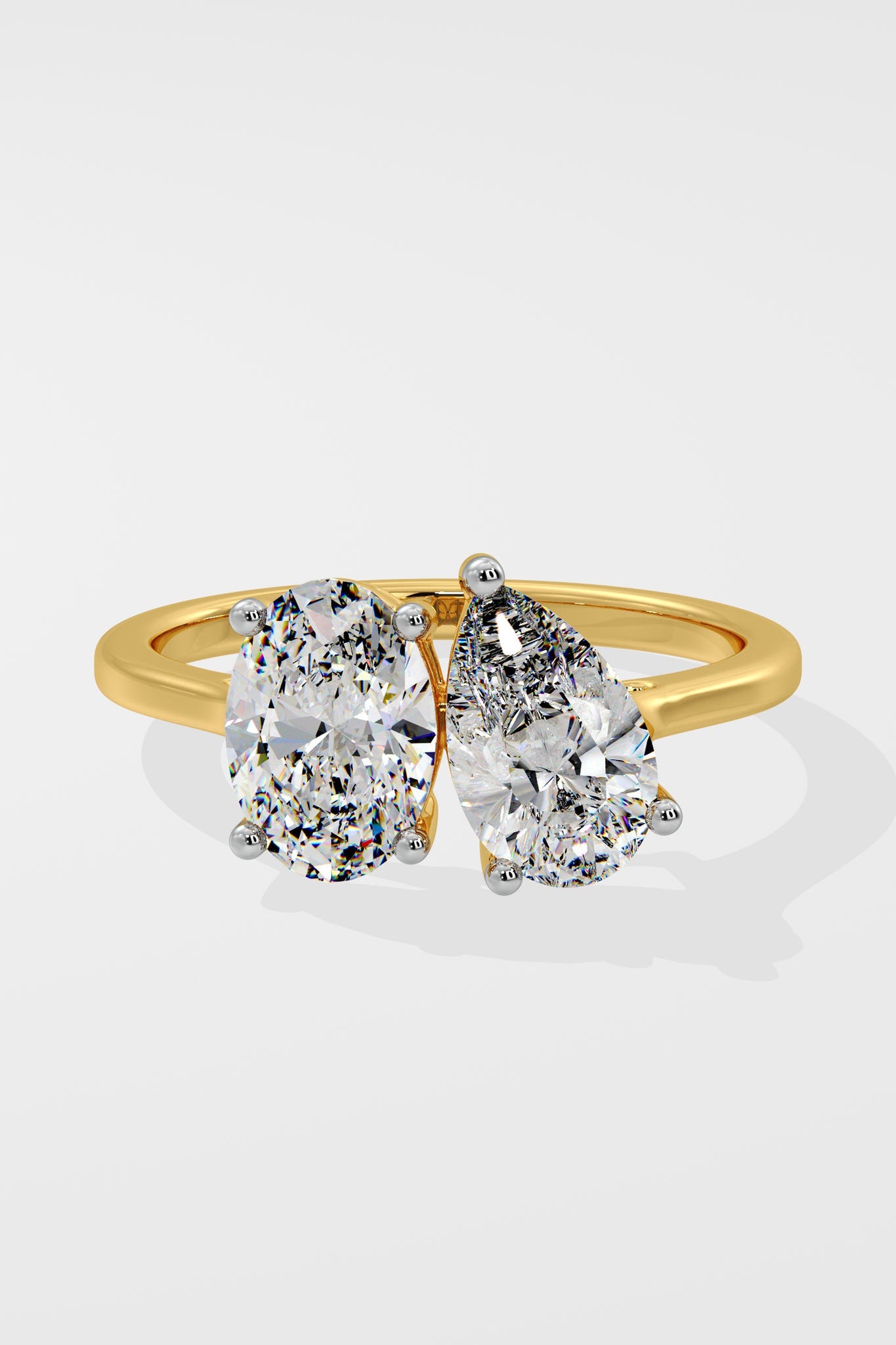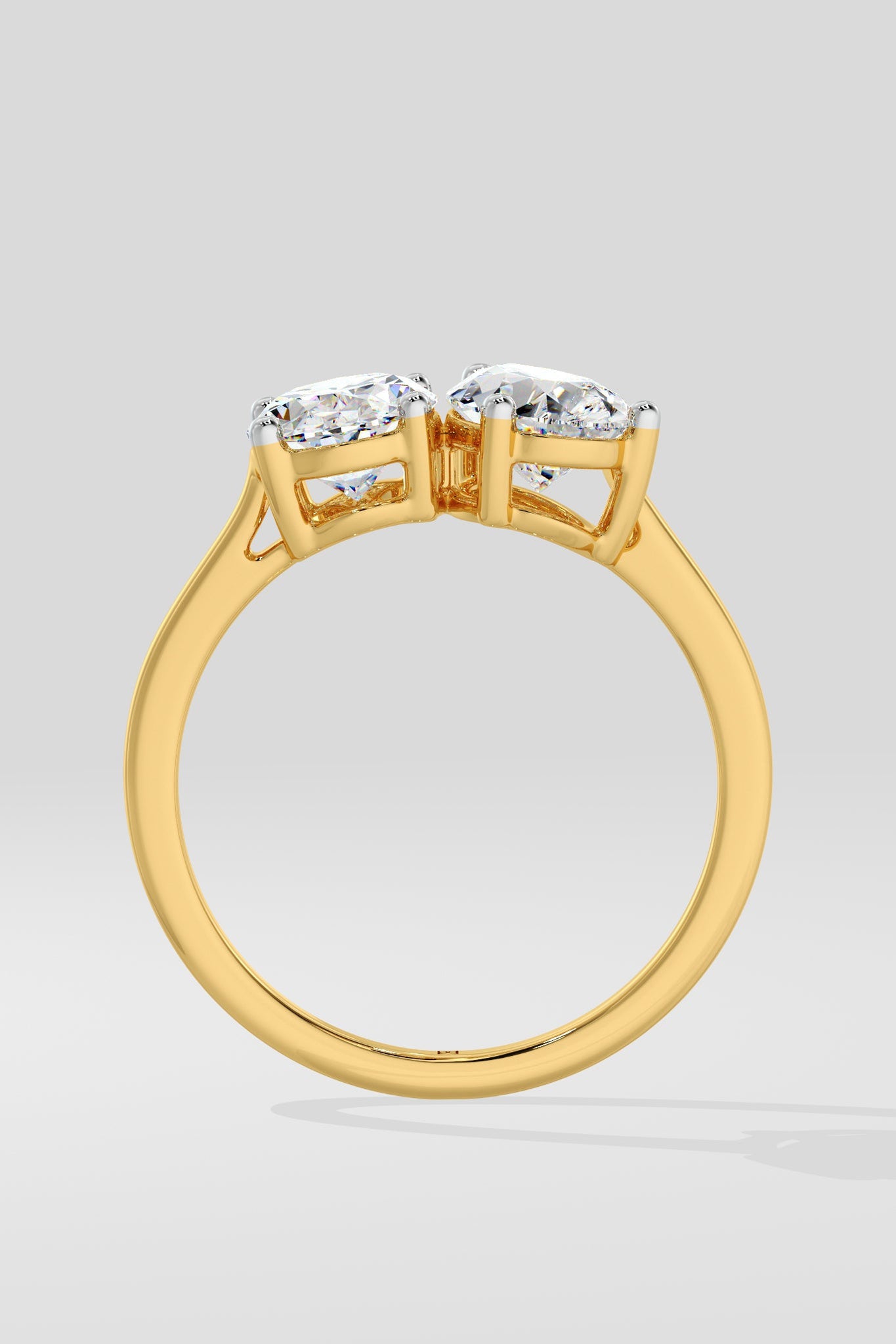 Celebrate an extraordinary love story with the Toi Et Moi Engagement Ring, a breathtaking emblem of unity and devotion. This enchanting design unites two exquisite lab-grown diamonds, each uniquely cut to reflect the individuality of your bond. Whether you choose the regal emerald and pear duo, the mesmerizing round and marquise blend, or the striking contrast of cushion and oval cuts, every pairing tells a story of profound connection.